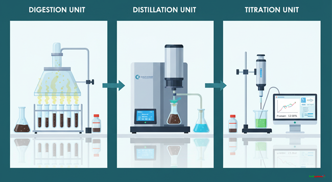 Kjeldahl process of protein content determination involves digestion of the sample in a Kjeldahl digester in the presence of concentrated sulfuric acid and selenium tablet,…